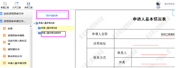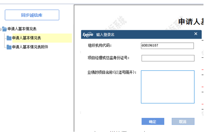 【申請人基本情況表】包含【申請人基本情況表】和【申請人基本情況表附件】兩個節(jié)點,其中,【申請人基本情況表附件】需從企業(yè)誠信庫中同步本單位證照等相關(guān)掃描件,請點擊‘同步誠信庫’按鈕,輸入基本信息,獲取誠信庫中的企業(yè)證照、項目經(jīng)理證照、業(yè)績掃描件等。