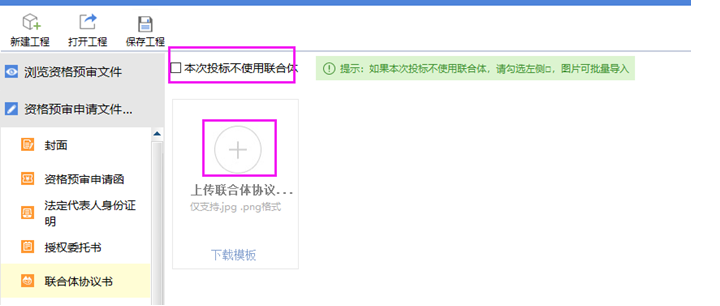 點擊【聯(lián)合體協(xié)議書】節(jié)點,點擊<+>按鈕,可以上傳jpg和png格式的掃描件,如果招標文件中提供了聯(lián)合體協(xié)議書模板,則可以點擊<下載模板>按鈕進行模板下載。