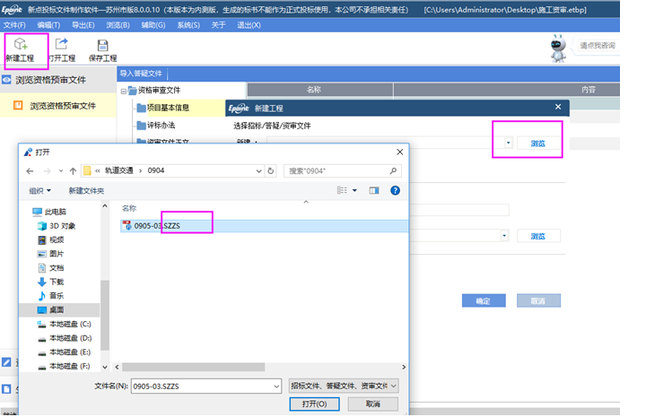 新建項目:點擊菜單欄上的文件>新建,或者點擊工具欄上的<新建工程>。點擊<瀏覽>選擇資審文件(*.SZZS格式)或者資審答疑文件(*.SZCS),點擊<打開>。在【創(chuàng)建新的工程文件】界面中投標工程文件的名稱是從資審文件中獲取的,然后點擊工程文件存放路徑的瀏覽按鈕,會彈出保存緩存件(*.etbp格式)的存放位置,請自行選擇保存位置并牢記位置,點擊確定即新建完成,進入投標文件制作界面。