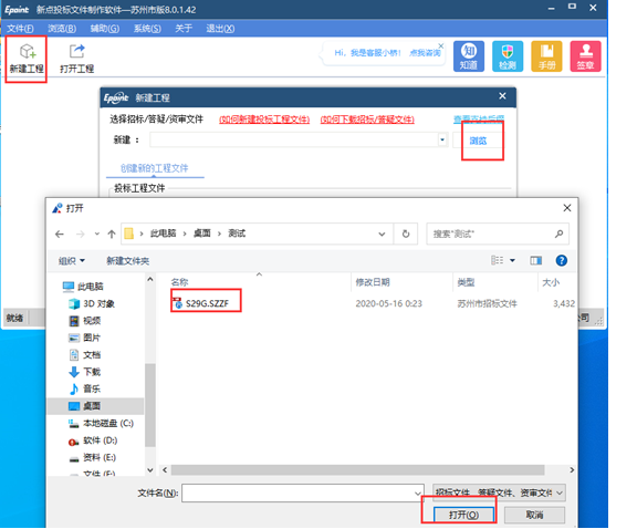 一、打開“新點投標文件制作軟件(蘇州市版)”導入招標文件或答疑文件。點擊【新建工程】菜單,在彈出的“新建工程”對話框中點擊【瀏覽】按鈕,選擇已經下載好的招標文件或澄清文件,再點擊【打開】按鈕,接著點擊“新建工程”對話框【確定】按鈕。