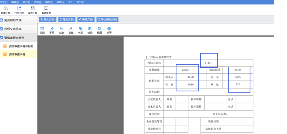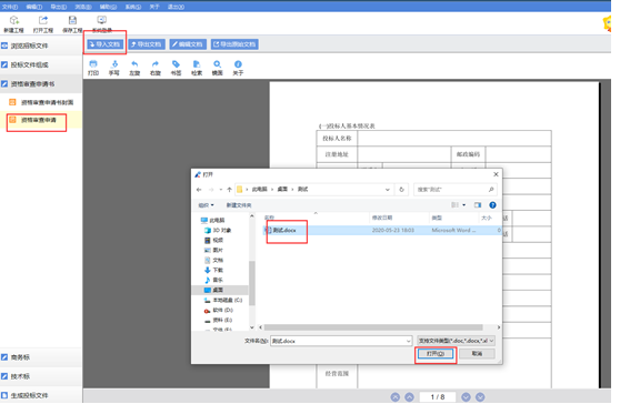 編輯資格審查相關內容。其中“資格審查申請”模塊,可以導入編輯好的Word文檔,也可點擊【編輯文檔】直接編輯,編輯完后點保存即可。