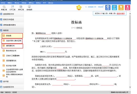 1.商務標模塊內,投標函、法定代表人身份證明、授權委托書按照要求在頁面上編寫即可(此節點也可能是直接導入響應文檔,請根據實際情況進行處理)。