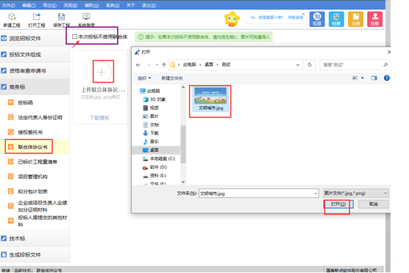 2.聯合體協議書。如果需要上傳聯合體協議書,點擊“+”號選擇對應文件,然后點打開即可;若不需要上傳聯合體協議書,直接在“本次投標不使用聯合體”處打鉤即可。