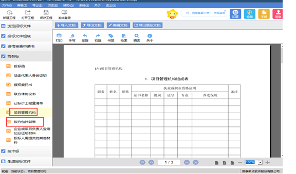 4.項目管理機構、擬分包計劃表,按照要求導入已編輯好的文檔,或直接點【編輯文檔】填寫信息即可。(可參照資格審查申請書—資格審查申請的做法)