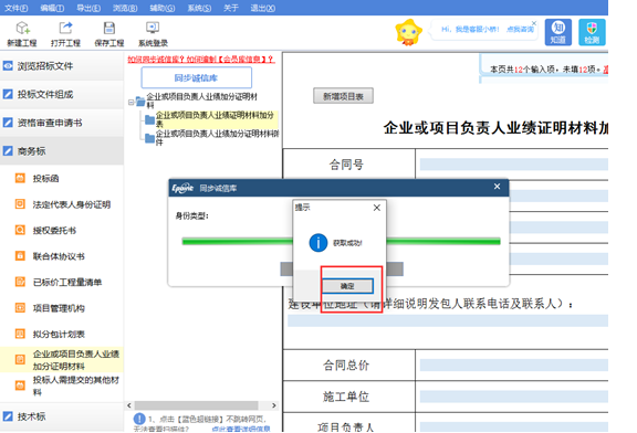(1)點擊【同步誠信庫】在彈出的對話框中輸入項目經理身份證號碼或名字、業績名稱(多個業績用逗號隔開),然后點“確定”,同步成功后點擊確定。