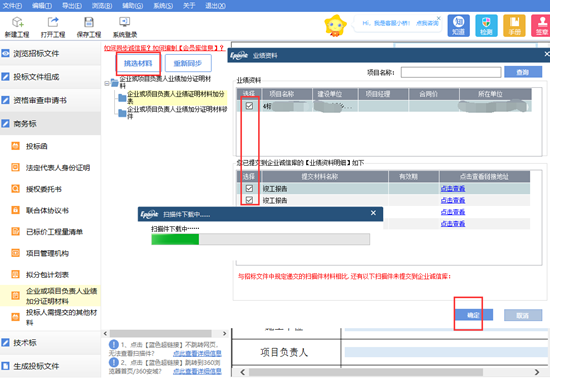 (2)挑選材料。點擊【挑選材料】在彈出的對話框中,勾選需要的附件材料,并點擊確定,附件下載完成后,在“企業或項目負責人業績加分證明材料”節點便可看到下載的附件。