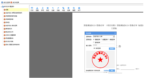 點擊【標書簽章】軟件會彈出簽章窗口,選擇需要簽章的文件點擊【簽章】,在彈出的電子章窗口輸入密碼,選擇要蓋章的位置進行簽章。