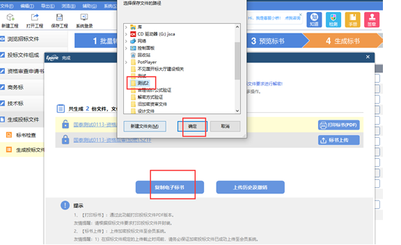 點擊【生成標書】軟件開始打包生成文件,文件生成后,點擊【復制電子標書】選擇要存放的路徑點【確定】文件生成保存完畢。生成的文件一共2份,1份是加密文件,一份是非加密文件。