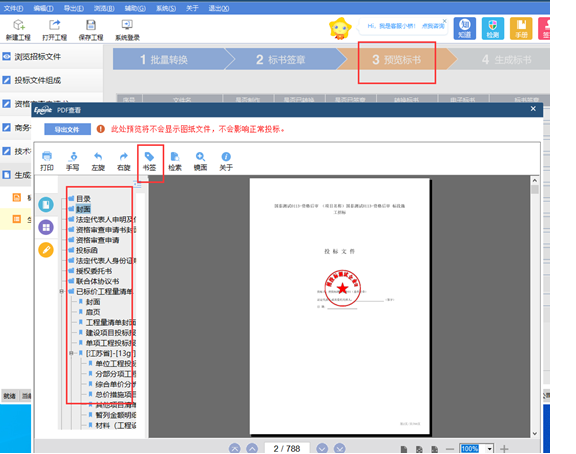 點擊【預覽表書】可預覽標書內容,還可點擊【書簽】展示標書的所有書簽,更方便查看標書內容。